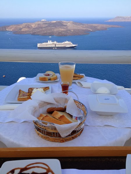 Brunching by the Mediterranean, with a view of the caldera and a platter of feta and graviera cheese, sun-dried Santorini tomatoes, tzatziki, sauce made of goat’s milk, black olive oil paste, fava bean puree and Greek pastas, giovetsi and skordomakarona. From our hotel, Adamant Suites, another ridiculously, soothing view of the capital city, Fira, and the town of Oia in the distance, typical blue & white homes from which occasional ribbons of smoke arose, the sunset, as it crested the cliff every evening, and the turquoise blue, pristine, gleaming waters.